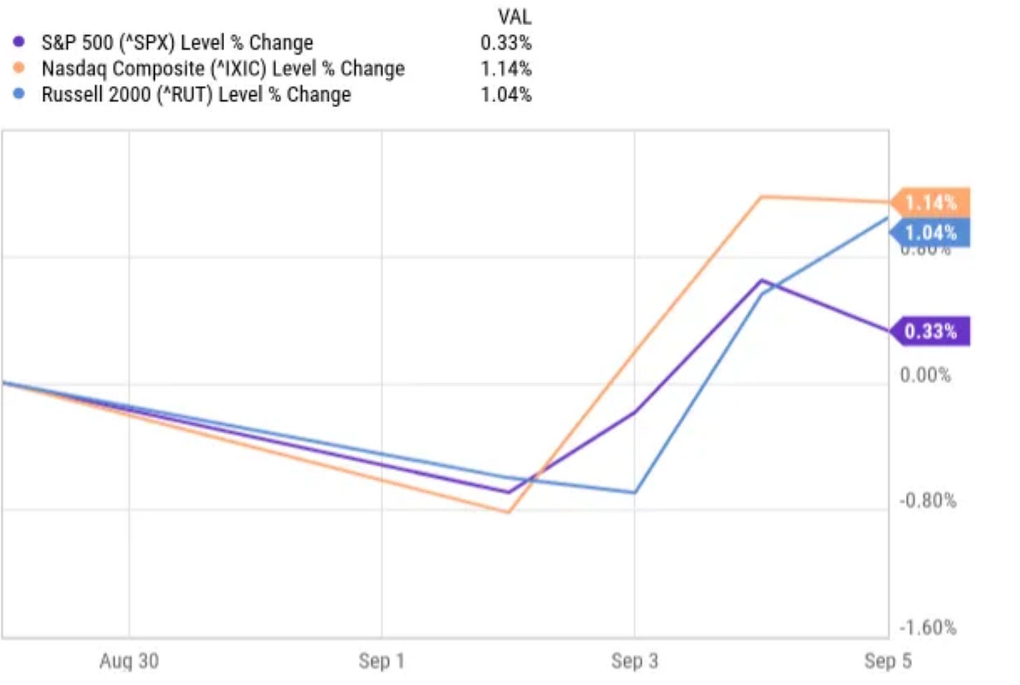 As you can see, together with me, the indexes were up. The S&P 500 underperformed the two others. It was up 0.33%, while the Nasdaq is up 1.14% and the Russell 2000 is up 1.04%.