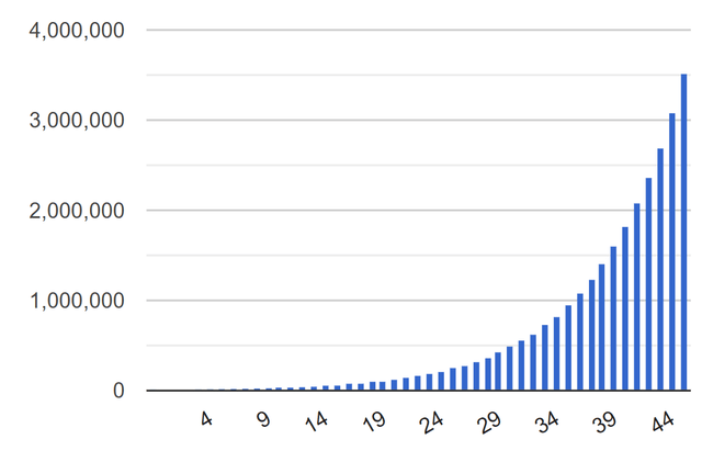 If Milo keeps that 6.5% return for the next 45 years, he will end up with €640K. Not bad for a €7K investment, right? Suppose he can achieve a return of 14% (which he can obtain if he listens more closely to his father), that would become €3.5M. All from an initial sum of €7,032, without any additional investment. That's the power of compounded interest.