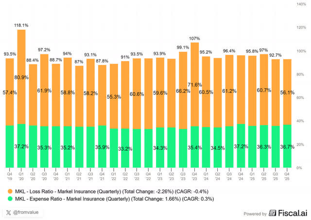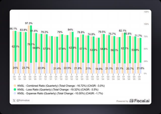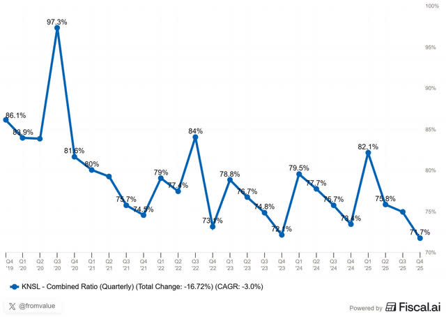 There’s something else that really popped out but on the positive side. The combined ratio of 71.7% is the best Kinsale has ever posted since going public. To quickly recap for newer readers: the combined ratio adds up an insurer’s loss ratio (how much it pays out in claims) and expense ratio (how much it costs to run the business). Below 100% means profit. The lower, the better.