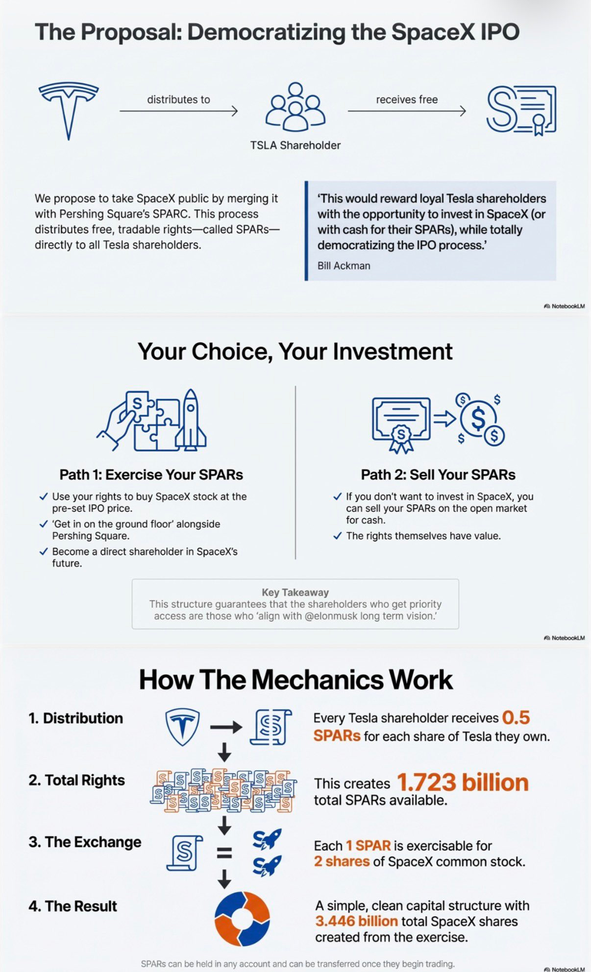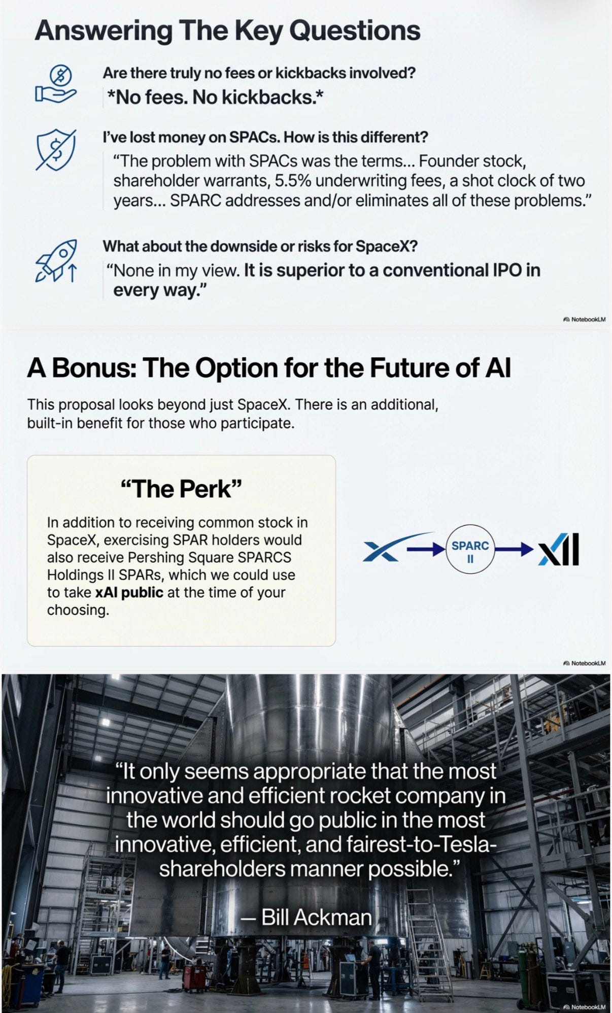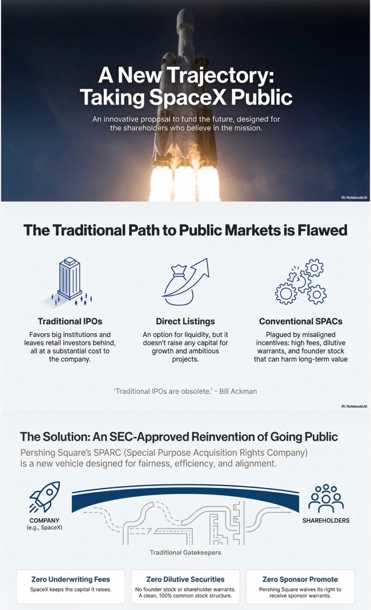 Never a dull moment on X. This week, Bill Ackman pitched Elon Musk an unusual idea: take SpaceX public by merging it with his approved SPARC vehicle. That means no bankers, no founder shares, no dilutive fees.