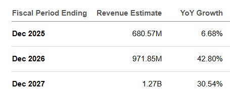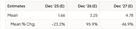 For 2027, expectations are a P/E of 27.8, but earnings growth of 47% still gives a PEG of just 0.59. So I think the stock could shoot up considerably in 2026 and 2027.