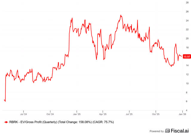 For comparison: sector peers CrowdStrike and Cloudflare trade at 34.3x and 45.8x EV/gross profit, respectively.