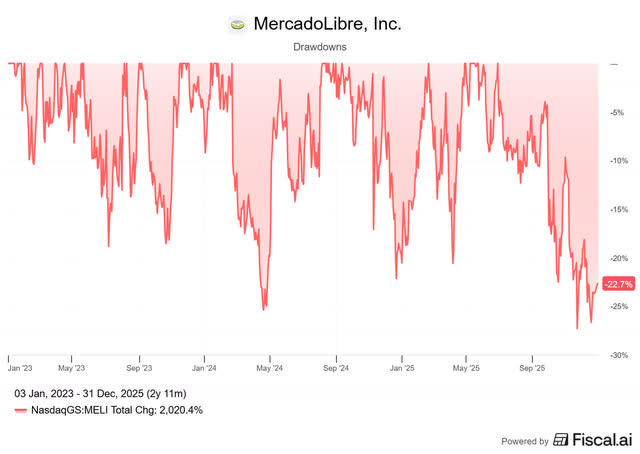 Latin America’s e-commerce giant and digital bank is currently reinvesting a lot of the money it makes, which is creating some negativity among analysts who only focus on the short term. The stock is currently 22.7% below its recent peak.