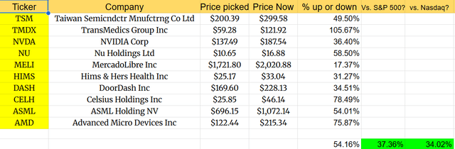 The results are very strong: an average of +54.16% per stock, beating the S&P 500 by 37.36% and the Nasdaq by 34.02%.