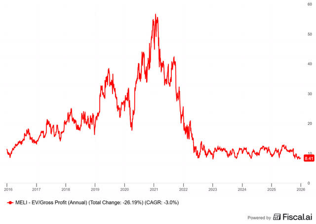 0.69 for 2026, 0.61 for 2027 and 0.45 for 2028. In other words: the market is undervaluing Mercado Libre’s growth potential. It’s my biggest position right now, but I keep adding.