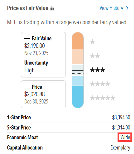 A crucial concept in investing is CAP, or Competitive Advantage Period. It’s the period during which a company can maintain its competitive advantage. Mercado Libre’s CAP is, by my estimation, exceptionally long. Morningstar also gives Mercado Libre a wide moat rating, meaning they estimate the company has a competitive advantage for 20 years or longer.