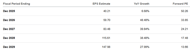 Looking at expected growth, you see a 2026 P/E ratio of 40.9. Many investors will find that outrageously expensive, but profitability is expected to increase by 96% in 2026.