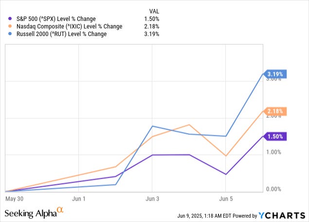 Despite the Musk-Trump fight, the stock market kept chugging up and up. The S&P 500 was up 1.50%, the Nasdaq 2.18% and the Russell 2000 was the biggest winner this week, with 3.19%.