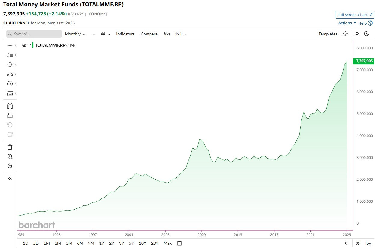 The market is full of contradictions. We just saw that the market is in extreme greed and at the same time, the money parked on the side has never been higher. A huge amount of $7.4 trillion stands parked in money market funds.