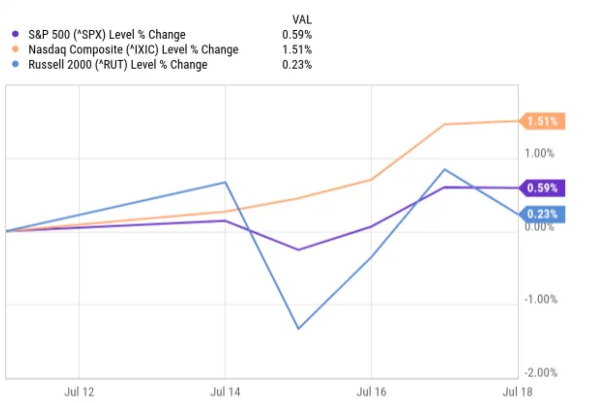 The markets were up again this week. The Russell 2000 had a volatile week but ended up 0.23%. The S&P 500 was up 0.59% and the Nasdaq was up 1.51%.