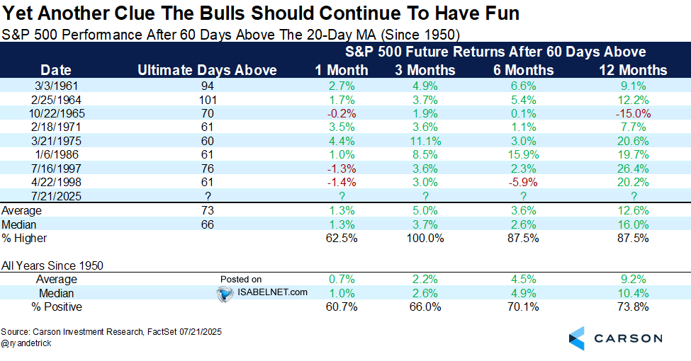 When the S&P 500 stays above its 20-day moving average for 60 days in a row, history says the rally’s not over: +16% median return over 12 months, and up 87% of the time.