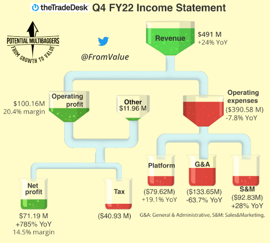 The Trade Desk’s Q4 2022 revenues grew 24% to $491M, a slight miss of $1.07 million compared to expectations. That's just 0.2%, so that's a rounding error and to me, revenue was in line with the expectations. Non-GAAP EPS came in at $0.38, beating the consensus by $0.02. This is a schematic overview of the earnings I have made.