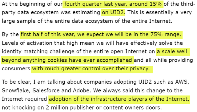 This was misunderstood by many investors, who thought, indeed, The Trade Desk would have to convince millions of content owners. While some big wins were announced, by integrating UID 2.0 into the internet's infrastructure, content owners started using the standard almost automatically, mainly because they knew cookies would be phased out.