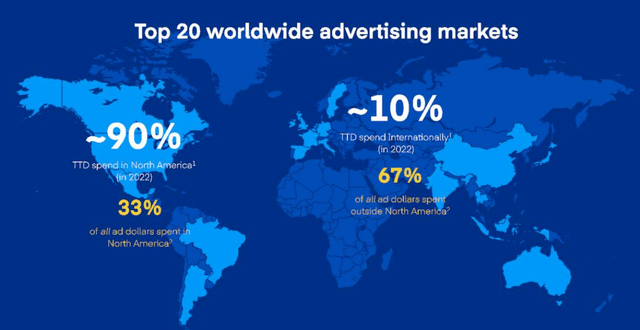 While 67% of ad spending is done outside North America, The Trade Desk only generates about 10% of its revenue outside North America. The company has already set up offices in light blue countries, but it takes time to build relations, and most offices are still relatively new.