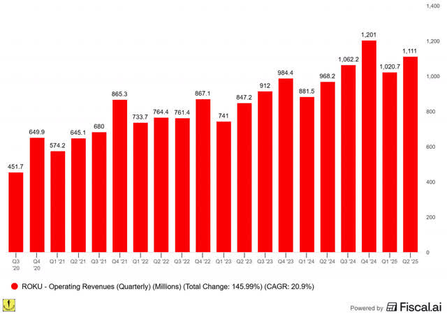 Roku beat revenue expectations of $1.07 billion, reporting $1.11 billion—up 15% year over year and 8.9% sequentially.
