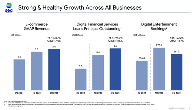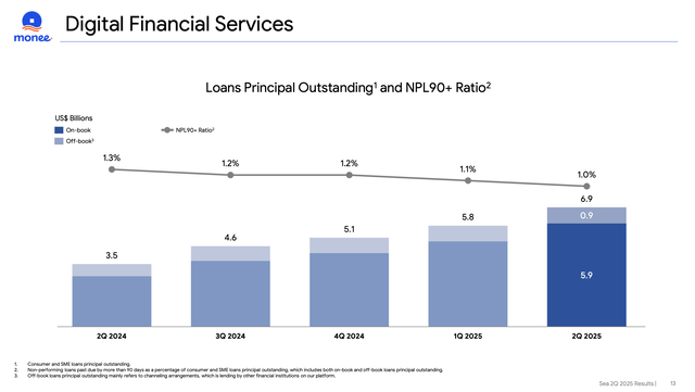 Sea Limited’s digital financial services segment, known as Monee, experienced significant loan growth in Q2 2025, with consumer and SME loans principal outstanding reaching $6.9 billion, marking a 94% year-over-year increase. The non-performing loans (’NPL’) ratio past due by more than 90 days remained stable at 1.0%, reflecting good credit quality and risk management.