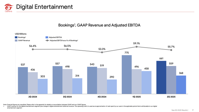 After a flying start to the year, Garena continued its strong growth momentum into the second quarter. Bookings were up 23% and adjusted EBITDA was up 22%, year-on-year. Multiple key titles delivered double- digit growth in the second quarter, including Free Fire, Arena of Valor, EA Sports FC Online, and Call of Duty: Mobile.