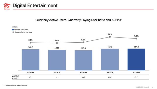 Once the weakest link, Garena rebounded this year. It delivered another solid quarter with slight year-on-year revenue growth. Quarterly Active Users increased compared to the previous quarter and also higher on a year-on-year basis. ARPU demonstrated similar performance, lower QoQ but higher YoY, which is what you should really look at, as in gaming as well, there is seasonality.