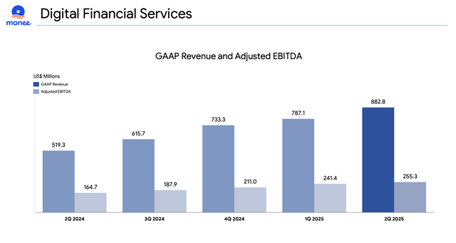 In Q2 2025, the digital financial services segment generated GAAP revenue of $882.8 million (a 70% increase year-over-year) and adjusted EBITDA of $255.3 million (up 55%). The segment continues to expand its credit product offerings, including on-Shopee SPayLater, off-Shopee SPayLater, and cash loans, with strong profitability and loan book growth. Monee became a key driver of the company’s quarterly growth.