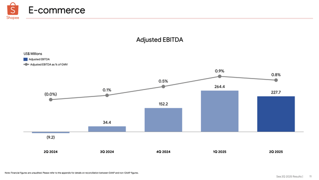 Adjusted EBITDA for e-commerce was positive at $22.7 million versus a loss of $9.2 million in Q2 2024