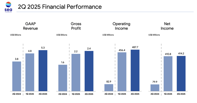 SEA crushed consensus revenue expectations by roughly $300 million, to $5.3 billion, or 6%. For revenue, that’s an impressive beat. Equally impressive: revenue growth of 38.6%.
