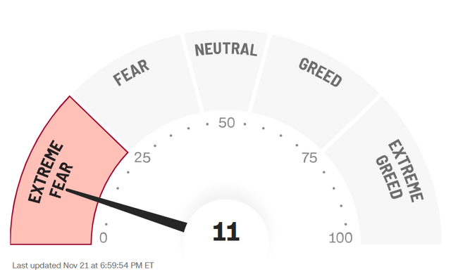 Obviously, the Greed & Fear Index kept dropping, too. It’s now at 11, but was at 6 earlier this week. That’s very low. It ticked 4 at the bottom in April.