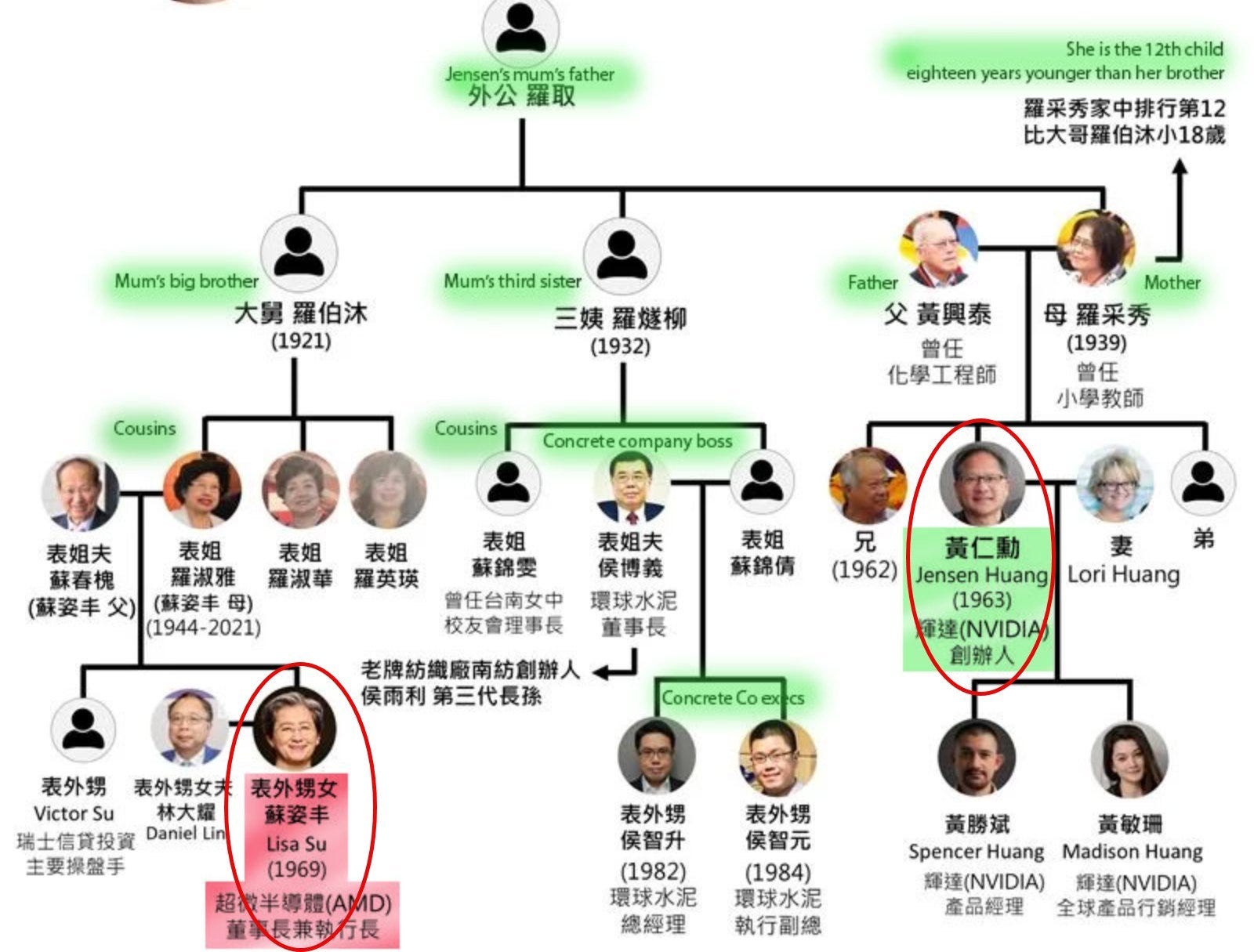 Both were born in Tainan, Taiwan and both immigrated to the US. Lisa's Su's mother and Jensen Huang are first cousins. Lisa and Jensen only got to know each other through their roles as CEOs of two of the most influential companies in the US.
