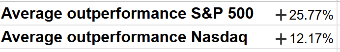The average Best Buys Now pick outperforms the Nasdaq by 12.17% and the S&P 500 by a whopping 25.77%.