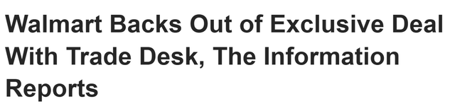 Most of the information I want you to know is in the two articles I linked aboveI have one more thing to add. It was brought out by The Information that Walmart renegotiated its deal with The Trade Desk from exclusive to non-exclusive. Again, as so often, the headlines were very deceiving. This is an example: