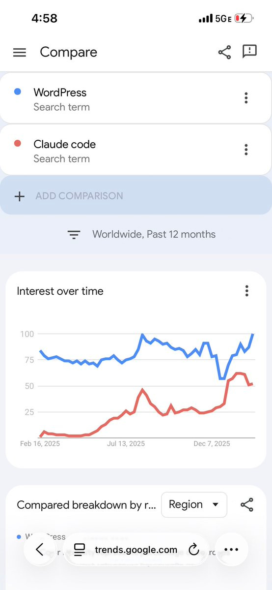 Someone posted this Google Trends chart comparing search interest for “WordPress” versus “Claude Code” over the past 12 months.
