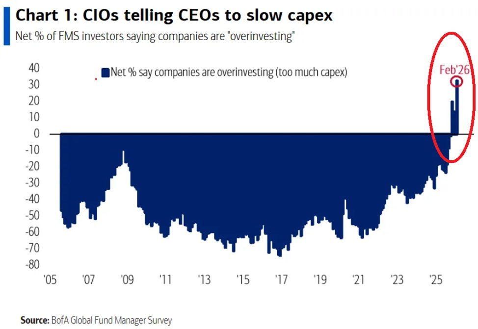For the first time in 20 years, a positive percentage of fund managers say companies are overinvesting. 35% of them now think capex is too high. For 20 years, fund managers have asked companies to invest more. Now they want them to stop.
