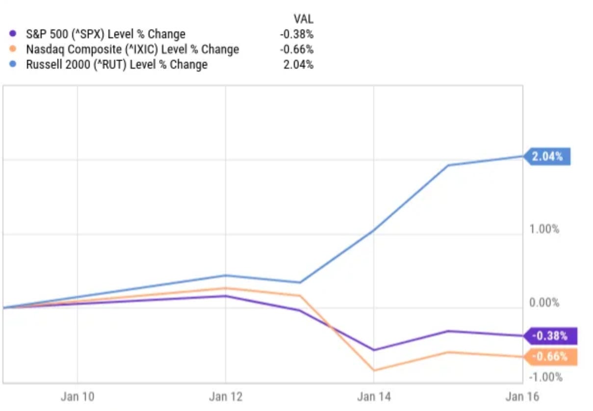 You see the same pattern as last week. The Russell 2000 outperforms the two other indexes. The Russell 2000 was up 2.04%, and the other two indexes were down. The S&P 500 was down 0.38%, and the Nasdaq was down 0.66%. For why the Russell 2000 is up while the others are down, I will repeat the reasons from last week, but add a third one.