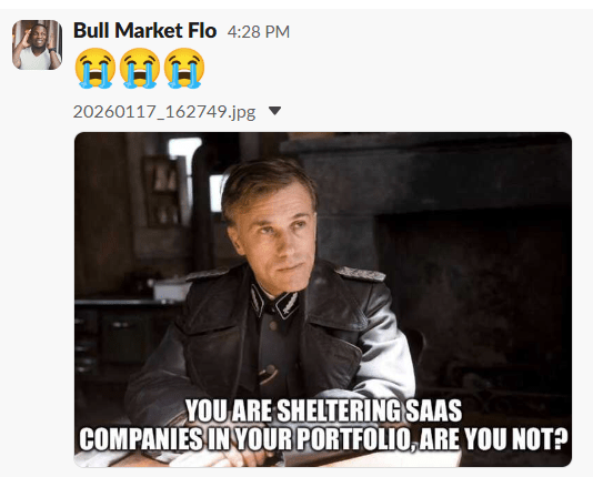 It’s indeed true that Software-as-a-Service companies have suffered recently. The “AI will kill everything” narrative is very strong right now. For a part, that will be warranted but for quite a substantial part, it won’t. That’s always the case. The market overreacts to both extremes. Some very interesting SaaS companies could become very attractive soon. We will follow this up, of course. But we are in the meme section of this article, so not too serious here. :-)