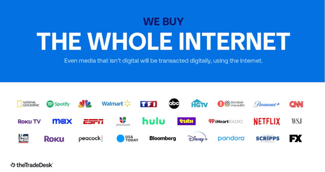 Green’s position is that The Trade Desk does not (and can’t) compete with the walled garden for their own supply. That’s also why The Trade Desk emphasizes that it buys the whole internet. From the earnings slides deck: