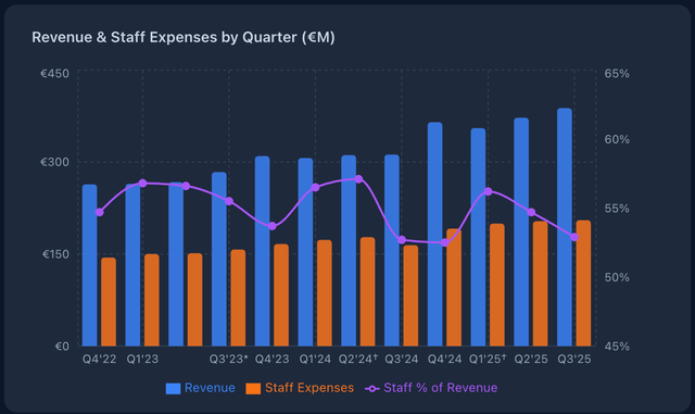 For the full year, staff costs were €835 million on €1,552 million in revenue, or about 53.8%. In Q4 specifically, this ratio dropped even further to around 52%. And this happened during a year of massive capital deployment, where newly acquired businesses typically come with a bunch of employees and usually drag efficiency down.