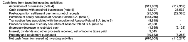 Now, a huge chunk of this was the Asseco Poland investment (€384.9 million net). But even excluding Asseco, the company completed acquisitions for total consideration of €390.4 million (including holdbacks and contingent consideration). The net cash spent on non-Asseco acquisitions was €248.3 million (€311 million in acquisitions minus €62.7 million in cash obtained with those businesses). That’s still an all-time record for Topicus.