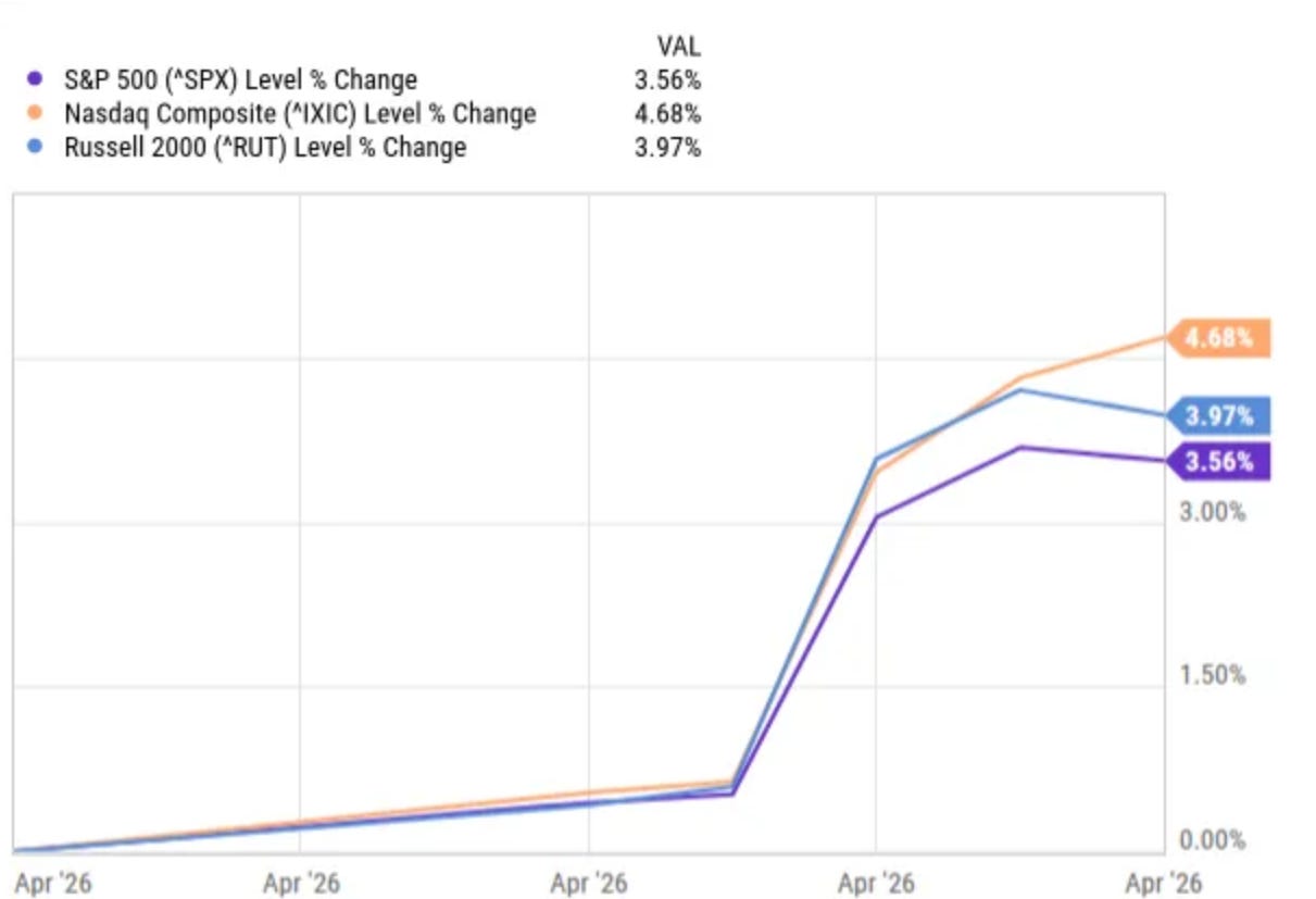 As you can see, the markets were up substantially again, just like last week. The Nasdaq won 4.68%, the Russell 2000 3.97% the S&P 500 3.56%.