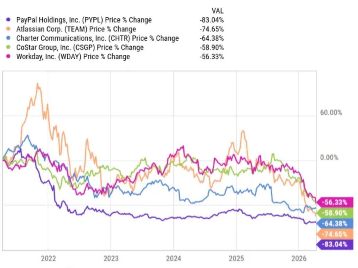 This week, the Nasdaq 100 has booted Atlassian (TEAM) from the Nasdaq 100. It is replaced by Sandisk (SNDK). There was not a single reason why Atlassian was replaced, but the fact that the stock is down the second-most over the last five years won’t have helped. Only “PainPal” did worse over the last five years.