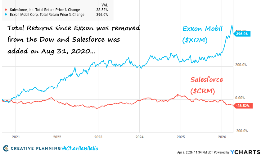 Charlie Bilello gave an example of this with an index replacement. In August 2020, Exxon Mobil was removed from the Dow Jones Industrial Average, and Salesforce replaced it. Exxon returned almost 4x since then, while Salesforce is down almost 40%.